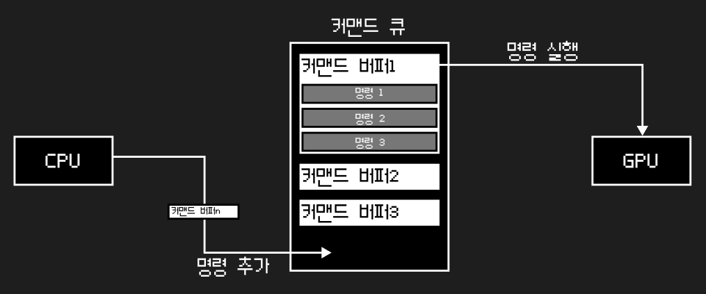 CPU는 실행할 명령들이 담긴 커맨드 버퍼를 계속 커맨드 큐에 등록하게 된다.