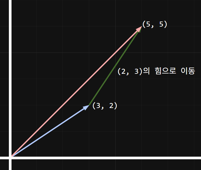 예를 들어 $(3, 2)$의 위치의 벡터를 $(2, 3)$만큼의 힘으로 이동시키면 $(5, 5)$의 위치에 점이 위치한다.