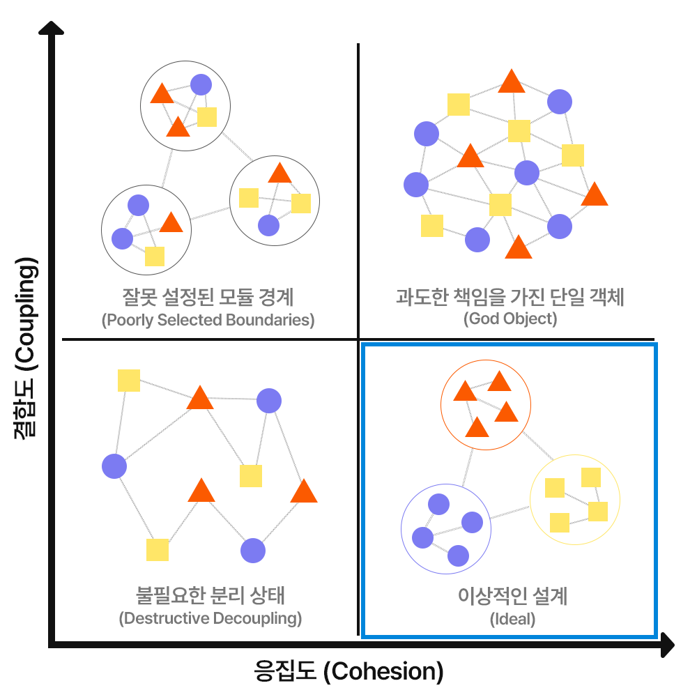 이론적으로는 높은 응집도를 가지고 있고, 낮은 결합도를 가지고 있는 모듈이 가장 좋다.