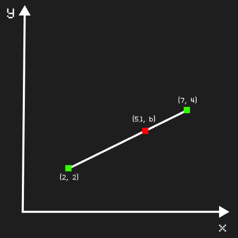 다음과 같이 $(2, 2)$와 $(7, 4)$에 두 점이 주어지고 $(5.1, b)$의 $b$값을 알고 싶다고 하자.