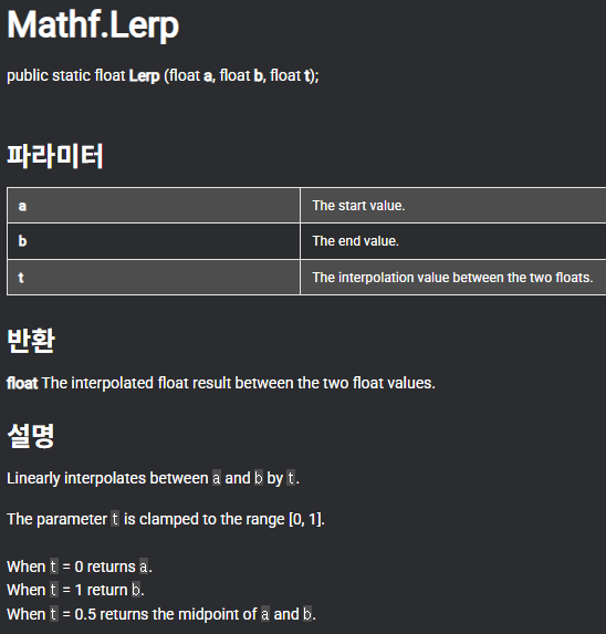 실제로 아래는 Mathf.Lerp()에 대한 Unity 공식 문서를 가져온 것이다.